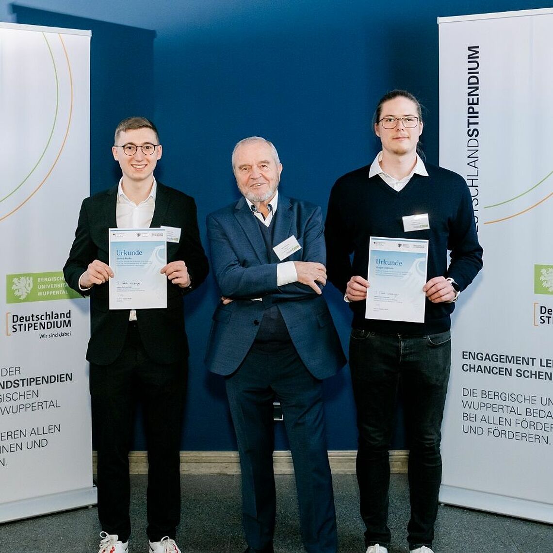 Das sind die Schmersal-Stipendiaten des Studienjahres 2023/24: Dennis Funke (l.) studiert Informatik und strebt den Abschluss Master of Science an, sowie Gregor Marioth (r.), der den Doppelstudiengang Informatik und Elektrotechnik belegt hat. Beide nahmen mit Dr. h.c. Dipl.-Ing. Heinz Schmersal an der von der Uni Wuppertal ausgerichteten Stipendienvergabefeier im Barmer Bahnhof teil.
