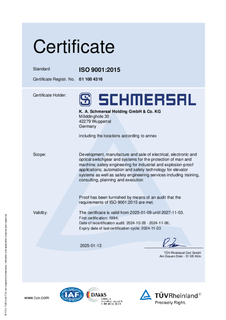 At Schmersal Böhnke+Partner, we pursue a holistic approach to quality management that runs through all phases of our company - from product development to production and customer service. Our aim is to ensure the highest standards in order to guarantee the safety and satisfaction of our customers.