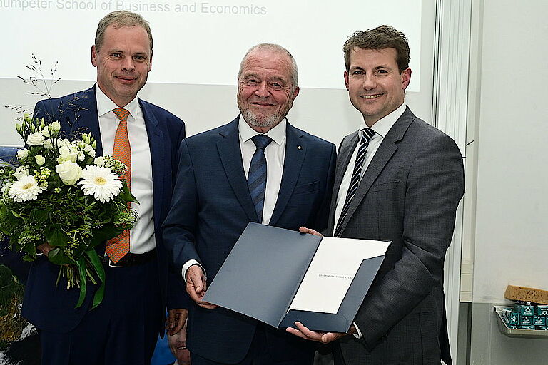 Das hebt die Bedeutung dieser Entscheidung noch hervor, die Prof. Dr. Peter Witt, Vorstandsvorsitzender der Schumpeter School Stiftung und Lehrstuhlinhaber für Technologie- und Innovationsmanagement, begründete: Heinz Schmersal, geschäftsführender Gesellschafter der Schmersal Gruppe seit 1982, trage immer wieder Impulse und Fragestellungen in die Fakultät hinein und teile sein praktisches Wissen auf vielfältige Weise mit dem Lehrpersonal und den Studierenden.