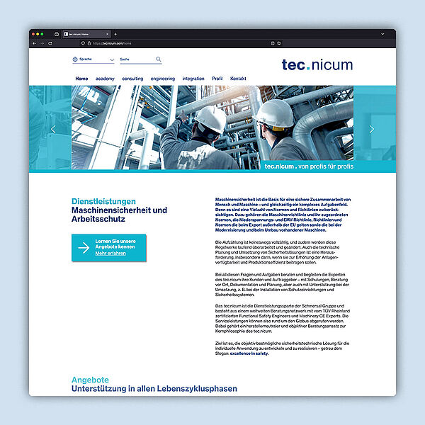 Die Website gibt einen Überblick über alle Dienstleistungen, die das tec.nicum rund um das Thema Maschinensicherheit bietet. Dabei umfasst das Serviceangebot des tec.nicum vier Segmente, die als einzelne Module oder Komplettpakete beauftragt werden können: