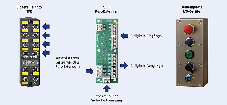 Ein besonderer Vorteil des SFB Port-Extenders liegt in der Möglichkeit eine größere Anzahl von nicht sicheren Schaltgeräten an die SFB anzuschließen. Diese lassen sich einfach anbinden und über die drei unterstützten Feldbusprotokolle auswerten – ideal für heterogene Systemlandschaften. Die Spannungsversorgung erfolgt dabei direkt über den SFB-Anschluss, was den Installationsaufwand reduziert und die Systemintegration vereinfacht.
