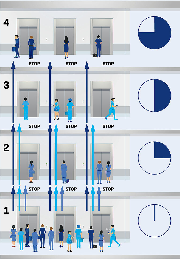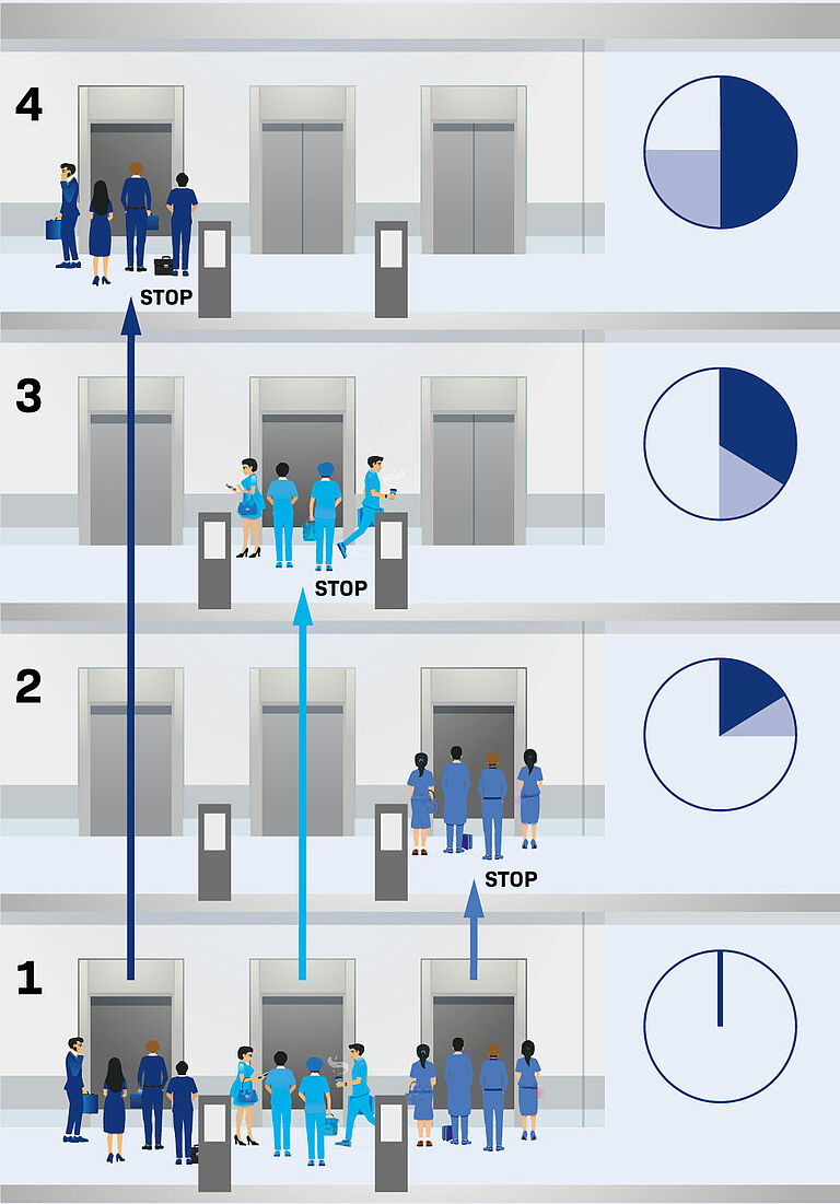 Das System gruppiert die Fahrgäste nach Zieletage im selben Aufzug, reduziert die Anzahl der Stopps und optimiert die Aufzugfahrt – integrieren Sie bpTARGET, um den Personentransport in Ihrem Gebäude zu verbessern.