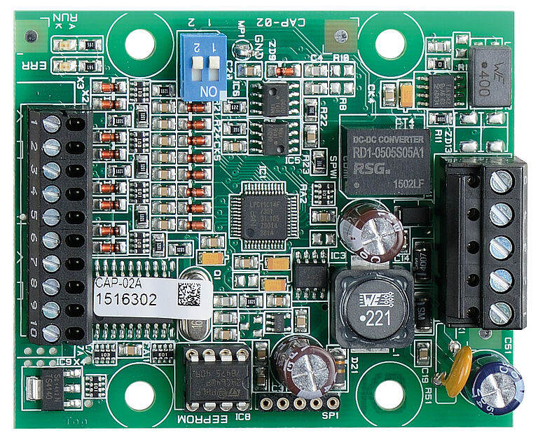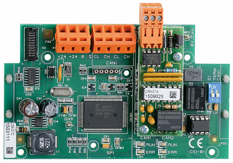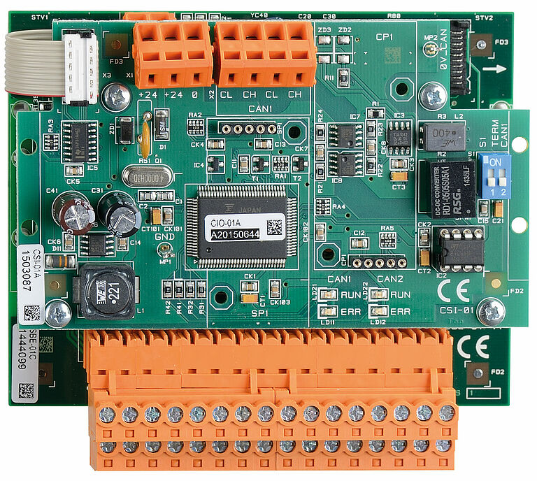 Zur Übertragung der Aufzugkabinensignale über den CANopen-Bus zum Prozessor. Status-LEDs ermöglichen eine erste schnelle Diagnose des CAN-Bus.