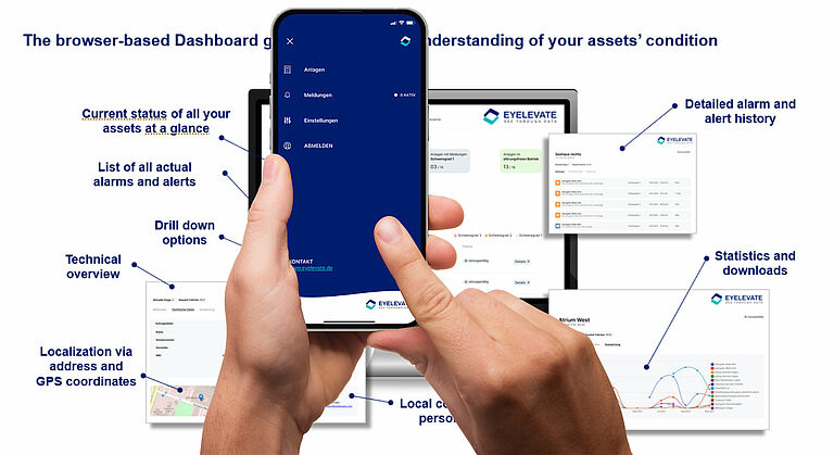 Die eingebauten Sensoren überwachen wichtige Funktionen Ihrer Aufzüge, sodass sie mit Hilfe von EYELEVATE Ihre Aufzüge immer im Blick haben. EYELEVATE wertet permanent Daten zum Aufzugverhalten aus, detektiert atypische Zustände und Szenarien und meldet diese z.B. per Push-Nachricht auf Ihr Tablet oder Ihr Smartphone. Mit EYELEVATE erhalten Sie eine neutrale Zustandserhebung eines unabhängigen Dritten für Ihren Aufzug.