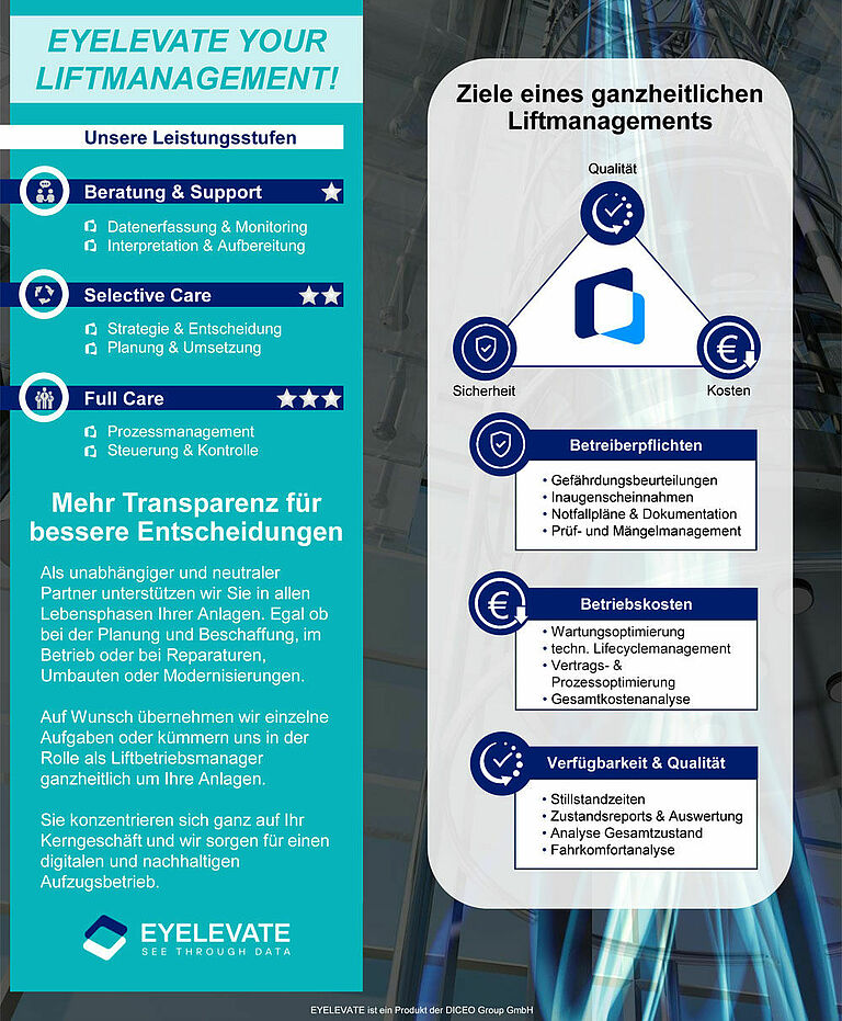 Da EYELEVATE grundsätzlich nicht mit der Steuerung der Aufzugsanlage verbunden ist, besteht trotz IoT-Technologie keine Eingriffsmöglichkeit von außen und somit kein erhöhtes Sicherheitsrisiko.